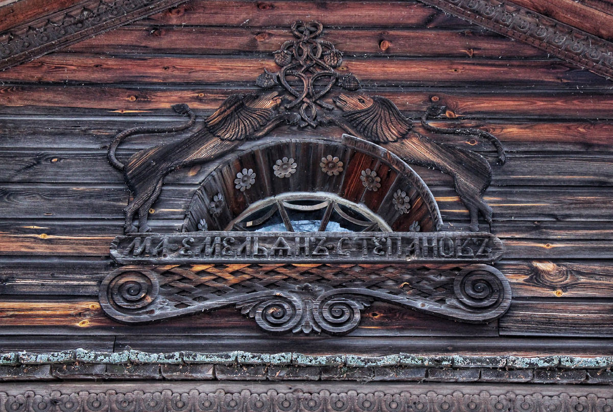Дом Андрея Григорьевича Серова Возле деревянного дома крестьянки А.Лоховой (Костромская слобода), что остался позади, высится двухэтажный терем лесопромышленника Серова. Он перевезен из деревни Мытищи (Макарьевский район Костромской губернии). Интересно, сильно ли отличаются они друг от друга внешне и внутренне? Судите сами. Прежде всего, я предлагаю Вам обратить внимание на фасад и боковые стороны терема- они щедро украшены резьбой, давайте рассмотрим подробнее. На фронтоне крыши чердачное окно выполнено в виде арочного углубления. По бокам его обрамляют резные львы, внутренний скат арочной ниши богат растительным орнаментом в виде цветочных розеток (ранее такие деревянные цветы я видела лишь как украшение иконостаса в церквях), внизу же сохранилась доска, на которой увековечено имя плотника- Емельяна Степановича Зиринова. Окна обоих этажей обрамлены филенчатыми ставнями, а нижние и верхние доски украшены резными розетками. Присмотритесь, на резных досках (в том числе