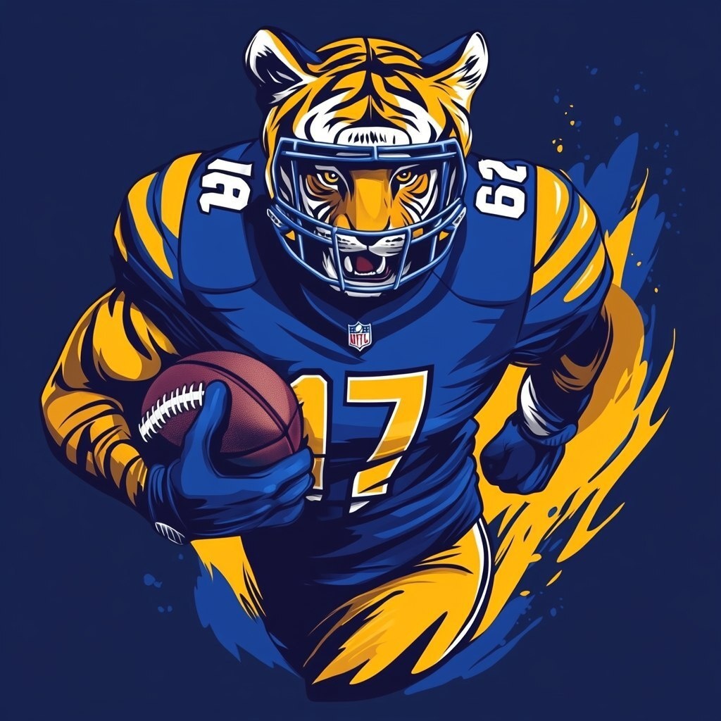 Создано на основе запроса: A tiger mascot as a American football player realistic style colors blue and yellow