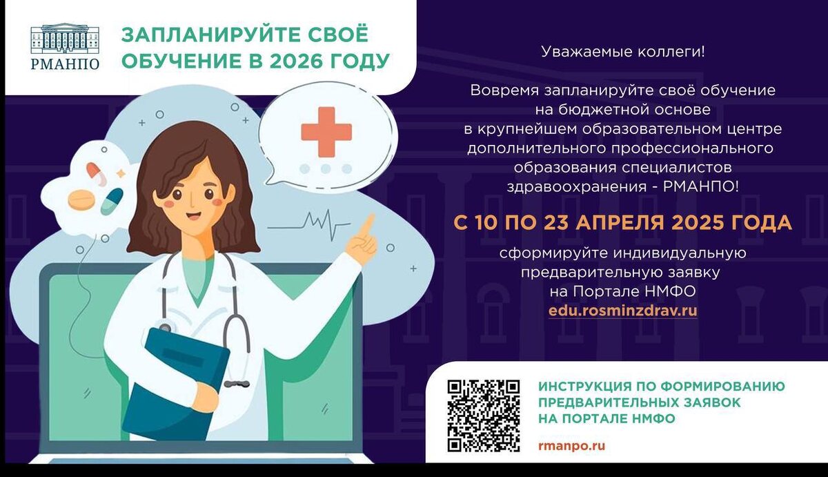 СТАРТ СБОРА ЗАЯВОК НА БЮДЖЕТНОЕ ОБУЧЕНИЕ В 2026 ГОДУ ⚡️С 10 по 23 апреля 2025 доступно формирование предварительных ИНДИВИДУАЛЬНЫХ заявок для обучения в 2026 году по программам ДПО работниками государственных и муниципальных медорганизаций (при наличии работников в ФРМР) 🤩 В прошлом году в РМАНПО и филиалах обучено более 48 000 врачей. Для подачи заявок в РМАНПО на 2026 год доступно более 1000 программ повышения квалификации и программы ПП практически по всем специальностям! А чтобы Вам было удобно выбирать программы, мы подготовили инструкцию 📎Инструкция по формированию работниками предварительных персональных заявок 🤩 Подписаться на Медобр Channel #заявки #ДПО #НМО #РМАНПО