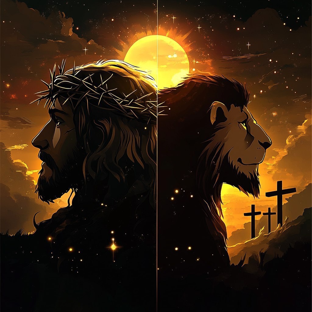 Создано на основе запроса: Illustration of a dark profile of jesus with the crown of thorns and the lion of Judah back to back, three