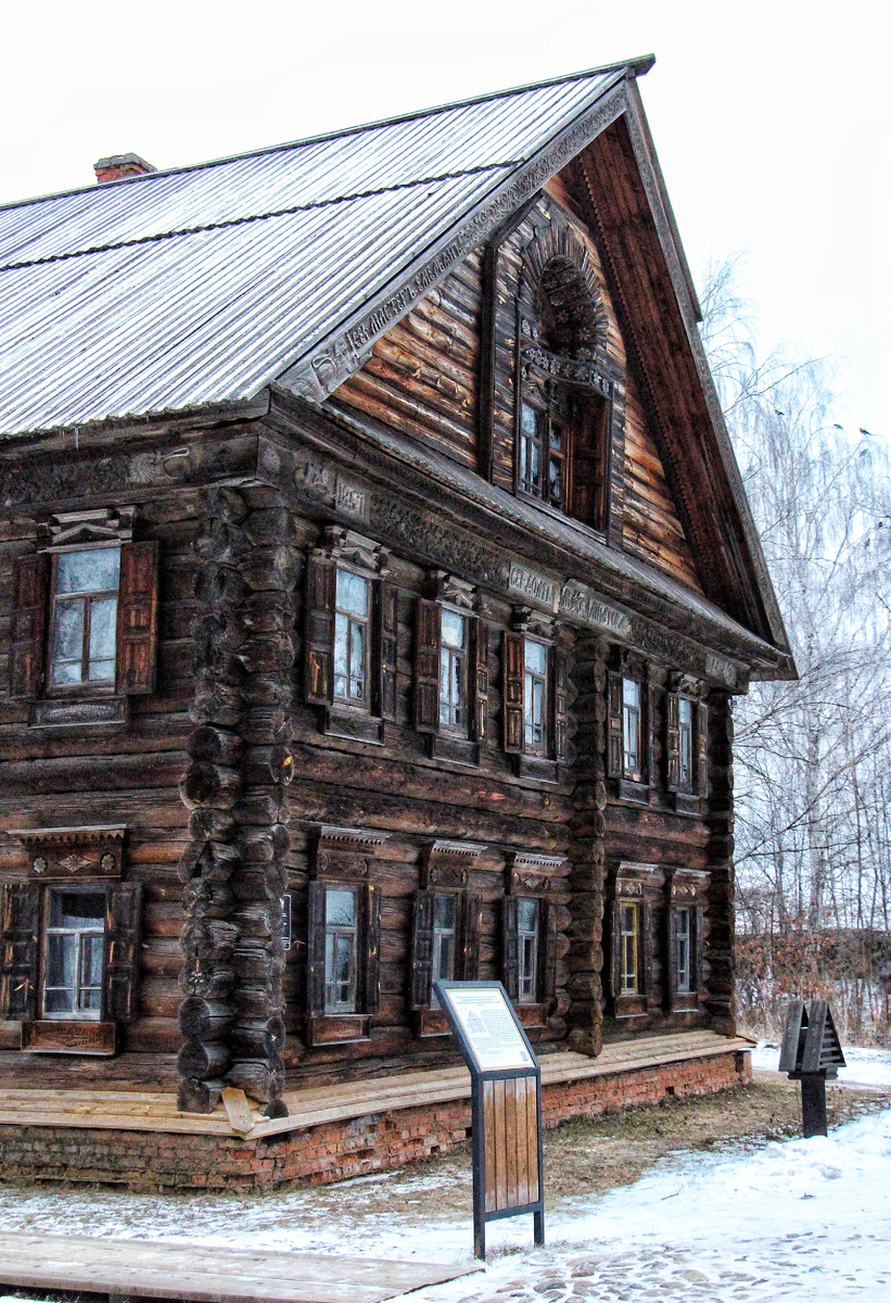 Гостей одного из теремов Костромской слободы встречает следующая табличка: «Дом Липатова 1857 год Перевезен из д.Журавлева Макарьевского р-на. Автор проекта реставрации Шапошников В.С. Двухэтажный дом-пятистенок на кирпичном цоколе. На первом этаже размещены: изба, мост, чулан, на втором этаже- четыре горницы, мост, хоздвор-двухъярусный: вверху помещение для хранения сена, средств передвижения, кладовые. Внизу- хлева для содержания скота, баня. Дом срублен и украшен резьбой знаменитым плотником и резчиком Емельяном Степановичем Зириновым. Принадлежит богатому крестьянину-лесопромышленнику. Схема 1-ого этажа: крыльцо, изба, горница, мост, клеть, чулан, хлева, баня, хоздвор.» Двухэтажный терем приковывает к себе внимание с первого взгляда. Крепкий, стойкий, мощный. Резьба здесь также выполнена умелой рукой плотника Емельяна Зиринова, как и в предыдущем тереме (пост по ссылке- ). Под карнизом проходит широкая резная доска, на которой вырезан растительный орнамент, дополненный и