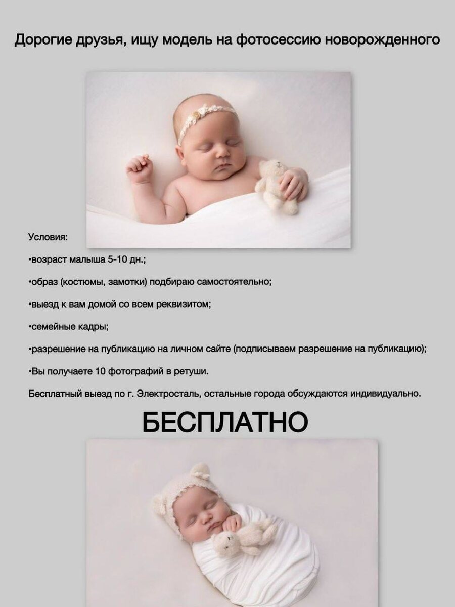 Дорогие друзья, ищу модель на фотосессию новорожденного БЕСПЛАТНО Условия: • возраст малыша 5-10 дн.; • образ (костюмы, замотки) подбираю самостоятельно; • выезд к вам домой со всем реквизитом; • семейные кадры; • разрешение на публикацию на личном сайте (подписываем разрешение на публикацию); Вы получаете 10 фотографий в ретуши. Бесплатный выезд по г. Электросталь, остальные города обсуждаются индивидуально. Предварительная консультация и запись по тел.: 8-965-305-04-05 Белла (WhatsApp, telegram)