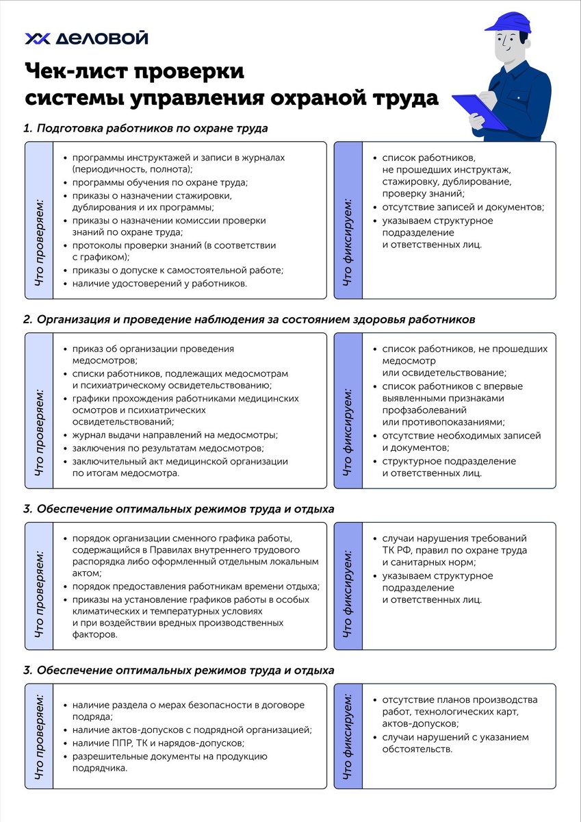 🎯 Чек-лист для проверки СУОТ: ваш помощник в соблюдении требований охраны труда Обеспечивать работоспособность системы управления охраной труда и проводить все необходимые мероприятия — задача не из простых. Работы много, а мелких нюансов ещё больше. Легко упустить что‑то важное, даже если вы опытный специалист. Чтобы вам было проще, эксперты «Деловой» подготовили удобный чек-лист для проверки СУОТ. 📌 Как использовать? 🔹 Пройдитесь по пунктам чек-листа. 🔹 Отметьте выполненные мероприятия. 🔹 Зафиксируйте, что нужно доработать или проверить позже. 📩 Скачивайте и сохраняйте чек-лист, чтобы он всегда был под рукой. Не забывайте, что его можно адаптировать под нужды вашей организации, добавляя или уточняя пункты.