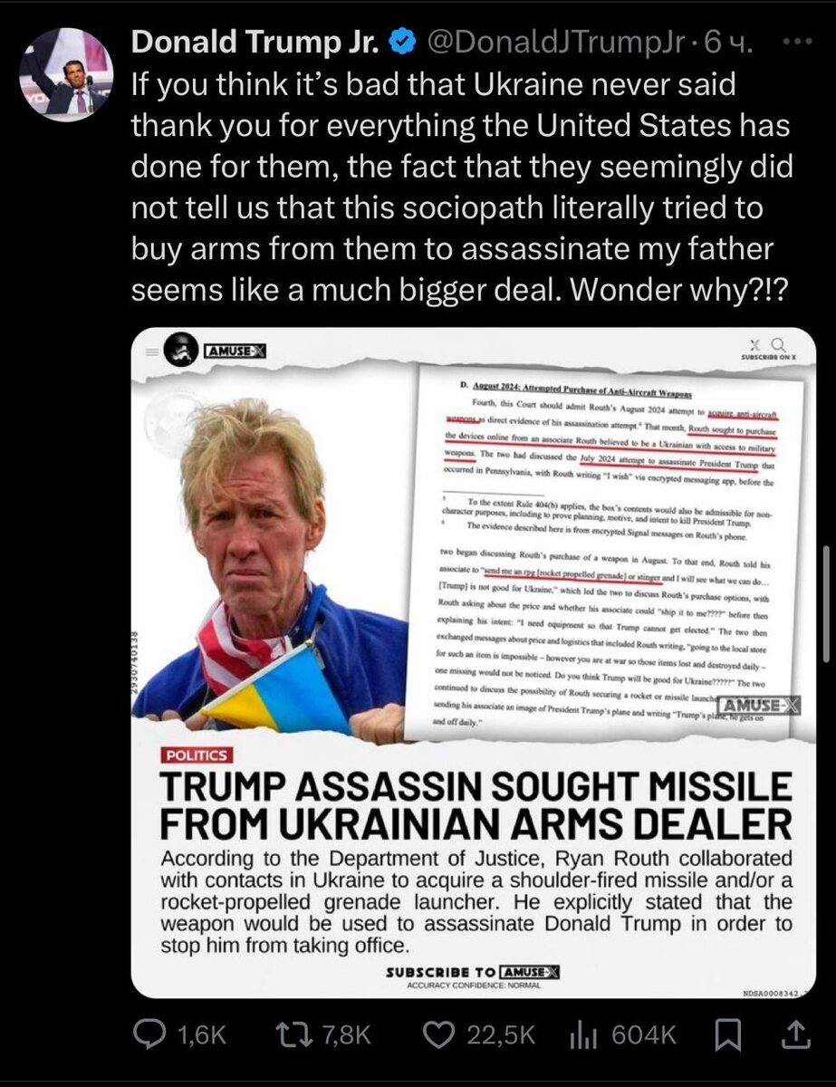 Минюст США сообщил: Райан Раут, стрелявший в Дональда Трампа, пытался достать оружие через Украину — запросил у ВСУ "Стингер" или РПГ, чтобы "уничтожить Трампа". Он рассчитывал, что американское вооружение, "теряющееся на поле боя", никто не будет отслеживать. Трамп-младший отреагировал на своей странице в соцсети X: "Если вы считаете, что плохо, что Украина так и не поблагодарила США за всё, что мы для неё сделали, то тот факт, что они, по-видимому, не сообщили нам, что этот социопат хотел купить у них оружие, чтобы убить моего отца — это уже гораздо серьёзнее. Интересно, почему?!" Речь уже не о "потерянных" Стингерах. Попытка убийства Трампа — и попытка достать оружие у ВСУ — превращает украинский вопрос из внешнеполитического в вопрос безопасности самих США. Когда даже случайный человек всерьёз рассчитывает на доступ к украинскому арсеналу, это ставит под сомнение саму систему контроля за оружием и бьёт по всей архитектуре трансатлантической безопасности. Киев молчит, что само по