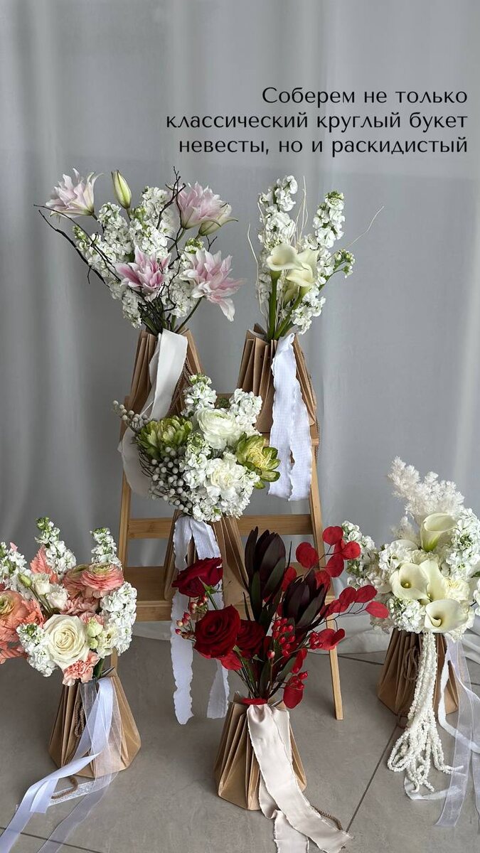 Свадебная коллекция 2025 —> продолжение Помимо классических круглых букетов невесты, мы также собираем раскидистые - асимметричные букеты в свободной сборке, но с соблюдением колористики и сочетаемости цветка 🌸 Все букеты собираются по пожеланиям невесты и предварительной консультации 📞 Записаться можно по номеру +7(960)04-05-111