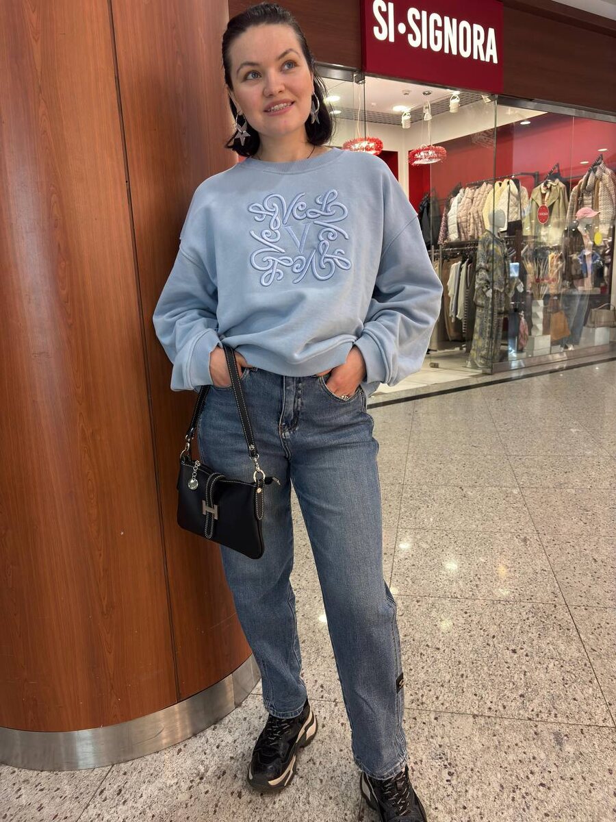 🩵🩵🩵 Джинсы момы с двойным лампасом🩵 Размеры от 44 до 54 🩵🩵🩵🩵🩵 Свитшот с фирменной вышивкой 🩵🩵Стильные защипы на рукавах VICOLO ITALY 🇮🇹 Размер единый 44-52 🩵🩵🩵🩵🩵