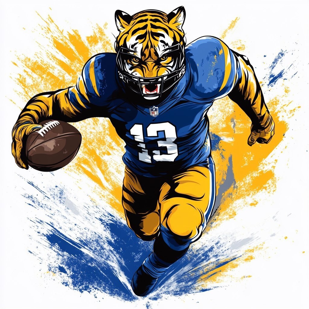 Автоперевод: Талисман Tiger как американский футболист реалистичный стиль цвета сине -желтого цвета.