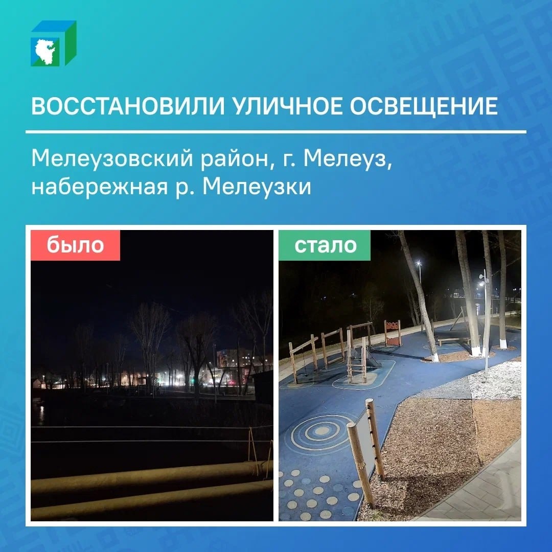 😀😃😄😁 7 апреля в Мелеузе на набережной р. Мелеузки восстановили уличное освещение. О том, что фонари не работают, местная жительница сообщила в соцсетях. Комментарий поймал робот ЦУР Башкортостана. Администрации Мелеузовского района и Мелеуза взяли обращение в работу. На набережную «Цветущий берег Мелеуза» выехали специалисты. Они обследовали систему уличного освещения и устранили неполадки – освещение на набережной восстановили. Информсистемы Центра управления республикой регулярно регистрируют сообщения по вопросам отсутствия или неисправности уличного освещения. За прошлую неделю, с 31 марта по 6 апреля 2025 года, робот ЦУР Башкортостана поймал 98 обращений по этой теме. 💚 ЦУР Башкортостана