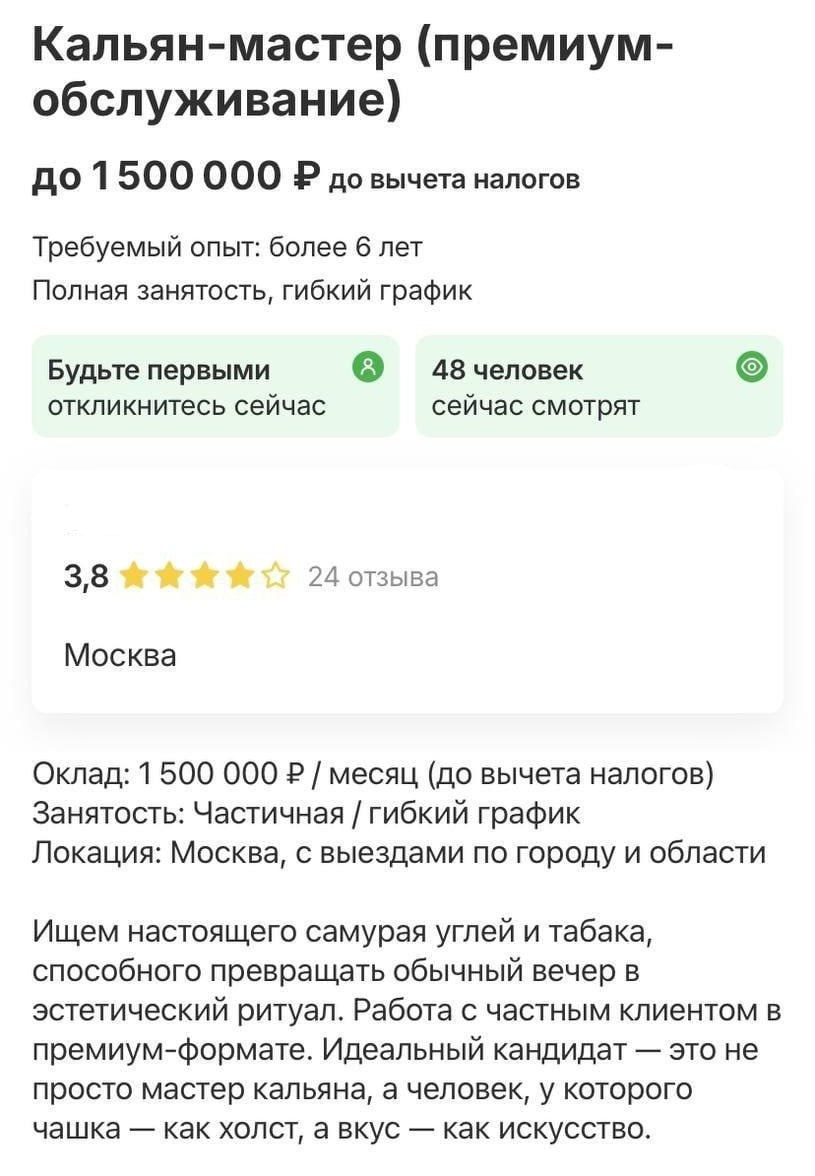 Кальянщик в Москве — теперь почти программист: зарплата до 1,5 млн в год. Ищу́т с 6-летним стажем и навыками дымного дзюдо. Выдыхай — это не шутка.