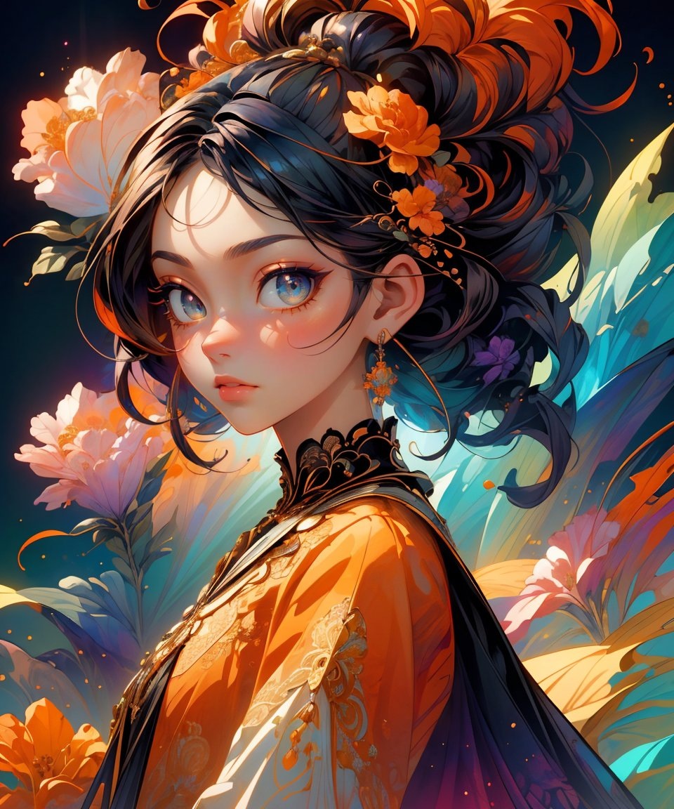 (лучшее качество, шедевр, официальное искусство, красиво и эстетично:1.2), 1 девушка, ЦВЕТ кожи, (серьги, украшения для волос), смотрит на зрителя, ветер, цветы, замысловатый фон, чрезвычайно детализированная, (фрактальное искусство:1.2), красочная, (ЦВЕТ:1.3), красочный шум, визуальный хаос, современная эстетика, кинематографический LUT