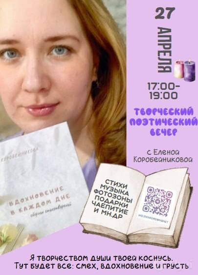 Живая встреча с автором в Ханты-Мансийске Готов сценарий и сюжет, Чуть-чуть волнуется поэт. Готова сцена, свечи, зал. Я в творческий ушла астрал. Актеры, встречи и волнение, И очень много вдохновения. Вам эту сказку создаю, Я так живу, я так люблю. Там будет все: слезы и смех. Я заряжу стихами всех. Ну что ж, конечно приходите И настроение прихватите) Приглашаю вас на уникальный авторский поэтический творческий вечер, который станет настоящим праздником слов и музыки! 😊 Это будет не просто чтение стихов, а волшебство касания струн души, игра слов и смыслов😊 Вы не только будете гостями, но и можете стать участниками всего процесса😊 Небольшое закулисье: ⏺Логическая сюжетная цепочка авторских стихотворений ⏺ Музыка и игра на инструментах ⏺ Подарки и сюрпризы ⏺ Атмосфера тепла и фотозоны ⏺ Творческий интерактив 💛 Этот вечер — не просто событие, это шанс стать частью большого творческого процесса и, возможно, открыть в себе грани творческого потенциала 💛 Не упустите шанс прико