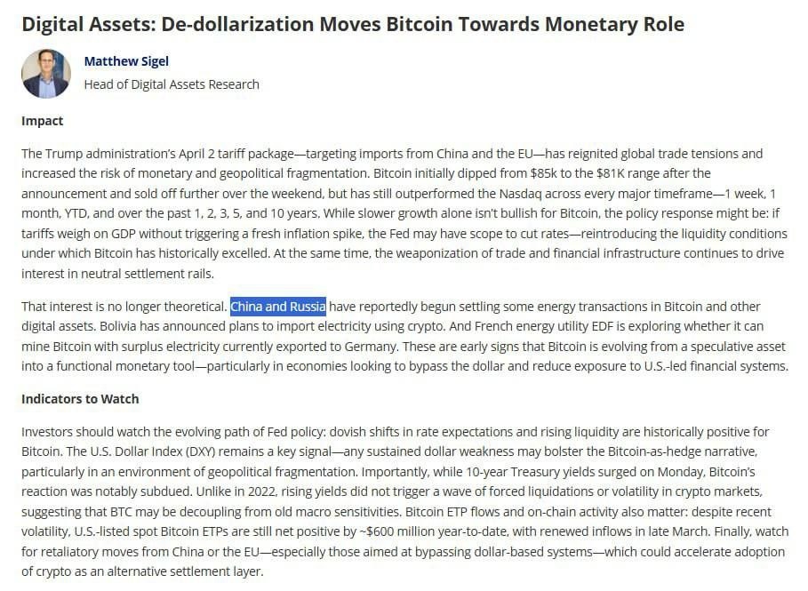 Китай и Россия начали использовать BTC для расчётов за энергоресурсы ▶️Это первые реальные шаги к созданию альтернативной финансовой системы, независимой от доллара, санкций и SWIFT. ▶️В условиях торговых войн и санкционного давления Bitcoin становится нейтральным инструментом.