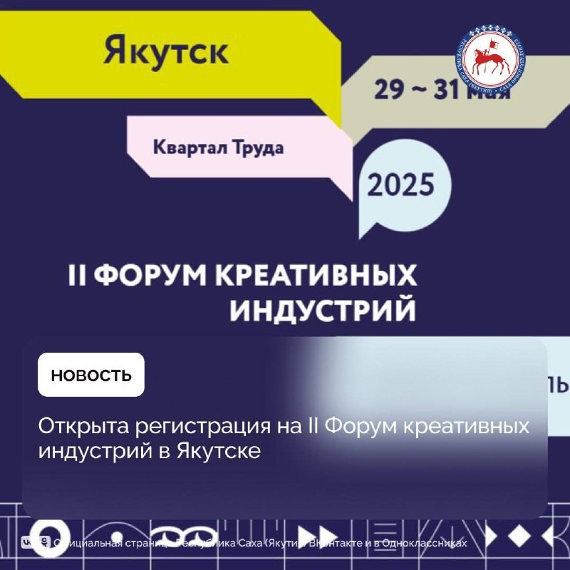 🖥🎶С 29 по 31 мая 2025 года в Якутске пройдёт II Форум креативных индустрий «Создано на Дальнем Востоке. От творчества к экономике». 🔹 Мероприятие организовано Министерством Российской Федерации по развитию Дальнего Востока и Арктики, Корпорацией развития Дальнего Востока и Арктики (КРДВ) и Правительством Республики Саха (Якутия). 🔹 Основной площадкой мероприятия станет креативный кластер «Квартал Труда», а также различные городские пространства, включая кинозалы и культурные учреждения. Зарегистрироваться к участию в Форуме можно уже сегодня по ссылке ⬅️ 📱 @Sakhagove #ПравительствоЯкутии