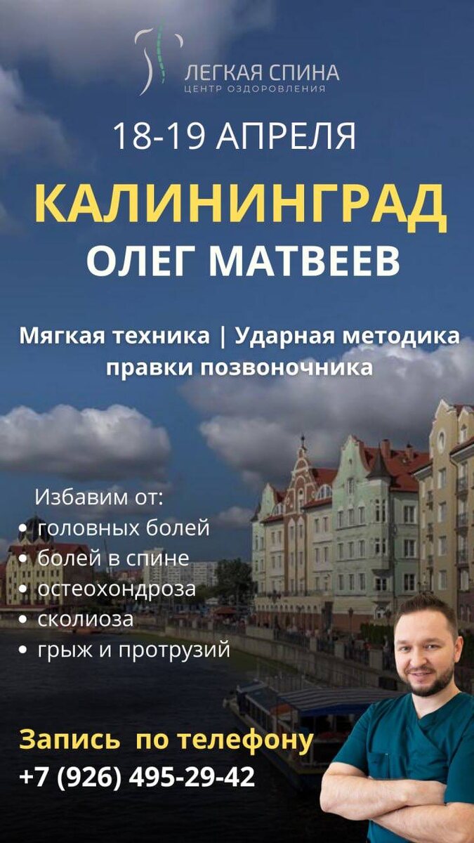 💥 КАЛИНИНГРАД 💥 ТЮМЕНЬ 💥 ПЕРМЬ Старший специалист центра Легкая Спина Олег Матвеев в ближайшее время будет принимать в регионах. 📍Пермь - 13 апреля 📍Калининград - 18 и 19 апреля 📍Тюмень - 27 апреля ✍️ Запись по телефону + 7 (926) 495-29-42 с 10.00 до 20.00 по Московскому времени