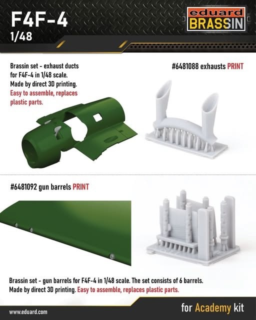 Чешская Eduard выпускает в апреле в своей серии Brassin на 3D-принтере выхлопные патрубки и пулеметные стволы для модели F4F-4 в масштабе 1/48 от Academy: