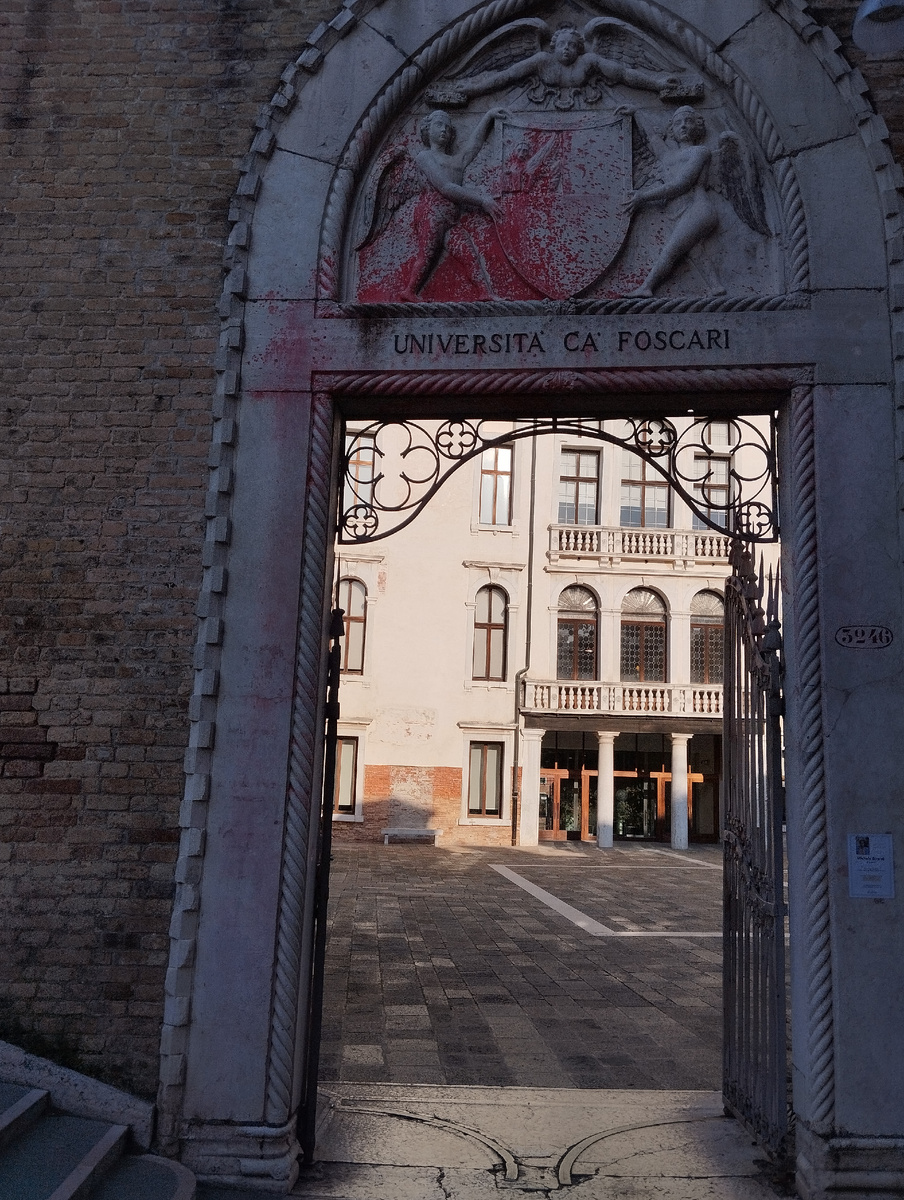 ЗАГАДКА КА ФОСКАРИ Венецианский университет находится в красивом историческом здании. Разница подходов: если в Москве победившего капитализма все культурные учреждения, редакции и вузы старались выгнать из центра, чтобы выкупить и устроить банки с офисами, то в колыбели торговых отношений и заковыристого права отдали сравнительно молодому университету шикарный дворец дожа 15 века! Университет был основан в 1868 году как королевская школа коммерции – и тут венецианская выгода! Статус университета получен лишь в 1968 года. В нем причудливая смесь факультетов - молекулярной науки, экономики, лингвистики стран Азии и Африканского Средиземноморья (Венеция никак не забудет своих купцов и владений). Но главное для нас, что здесь сохранилась каким-то чудом кафедра русистики, которую долго возглавлял ученый славист и переводчик с мировым именем Витторио Страда. В Венеции я начинал и завершал итальянскую неделю с неудобным графиком пребывания, но очень хотел побывать в университете и хоть кратко
