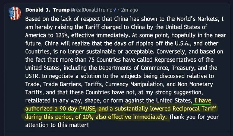 Трамп снова дал рынку надежду. Или иллюзию? Вчера Дональд Трамп выкатил резонансное заявление: тарифы на Китай официально подняты до 125% — немедленно и без сантиментов. Но тут же — резкий поворот: “Я авторизую 90-дневную ПАУЗУ и существенно снижаю взаимный тариф до 10% на этот период”. Что это значит? 1. Формально тарифы повышены, как акт силы и давления. 2. Фактически — включена отсрочка. На 90 дней установлен “мягкий режим”, якобы для дипломатического окна. Рынок отреагировал мгновенно: бурный отскок, рост биткоина, скачки по индексам. Но если смотреть глубже — ничего не решено. Это не откат, а приостановка казни. Через 90 дней снова начнётся бой. И нет гарантий, что следующий раунд будет мирным. Трамп сделал ход, который можно интерпретировать как “шанс на диалог”. Но он также оставил за собой полное право обрушить всё в любой момент. Это стратегия рычага и давления, а не стабильности. На что стоит обратить внимание: • 90 дней — это не облегчение, а обратный отсчёт. • Р