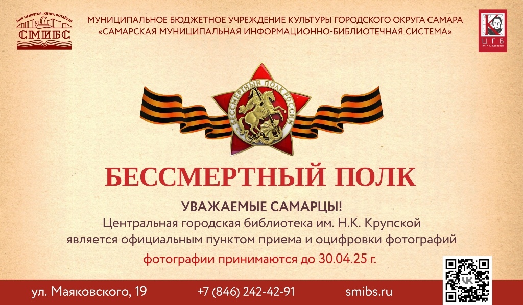Уважаемые самарцы! В рамках празднования 80-й годовщины Победы советского народа в Великой Отечественной войне 1941-1945 годов и в рамках ежегодного Общероссийского движения «Бессмертный полк» МБУК г.о. Самара «СМИБС» в Центральной городской библиотеке им. Н.К. Крупской действует пункт оказания помощи гражданам по оцифровке фотографий ветеранов Великой Отечественной войны. Нет такой семьи, которая не пострадала бы от войны. Каждый из нас может стать личным архивариусом истории своих предков. Библиотека помогает самарцам вести эту подлинно народную летопись с большой ответственностью и высоким профессионализмом. Специалисты СМИБС помогут оцифровать фотографии. Готовые работы выдаются в формате А-3, ч/б. Желающие могут обратиться по адресу: ул. Маяковского, 19 (Самарская, 190 Б) Сроки предоставления фотографий для оцифровки до 30 апреля 2025 года. Сохраним светлую память о наших героях! Больше интересных новостей читайте на сайте СМИБС и в социальных сетях: ВКонтакте и Одноклассники #Нов