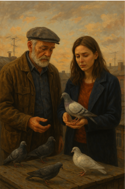 Виктор Степаныч жил на окраине посёлка в доме, где больше ничего не напоминало о семье, кроме единственной фотографии — пожелтевшего снимка с женой и маленькой дочкой. Дом стоял на отшибе, зарос травой, пах рыбой и кормом для птиц. Вся его жизнь была устроена по чёткому распорядку: утром — голуби, днём — забота о голубятне, вечером — радио и самодельный ужин. Его не тяготило одиночество. Он давно научился жить в звуке хлопающих крыльев. И всё же в глубине — гулкая щель. Пустая, как гнездо после улетевших птенцов.