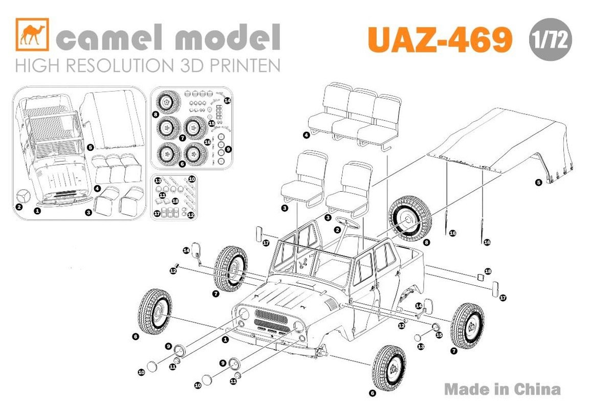 Camel Model из Китая показала состав набора своей выращенной на 3D-принтере модели УАЗ-469 в масштабе 1/72.