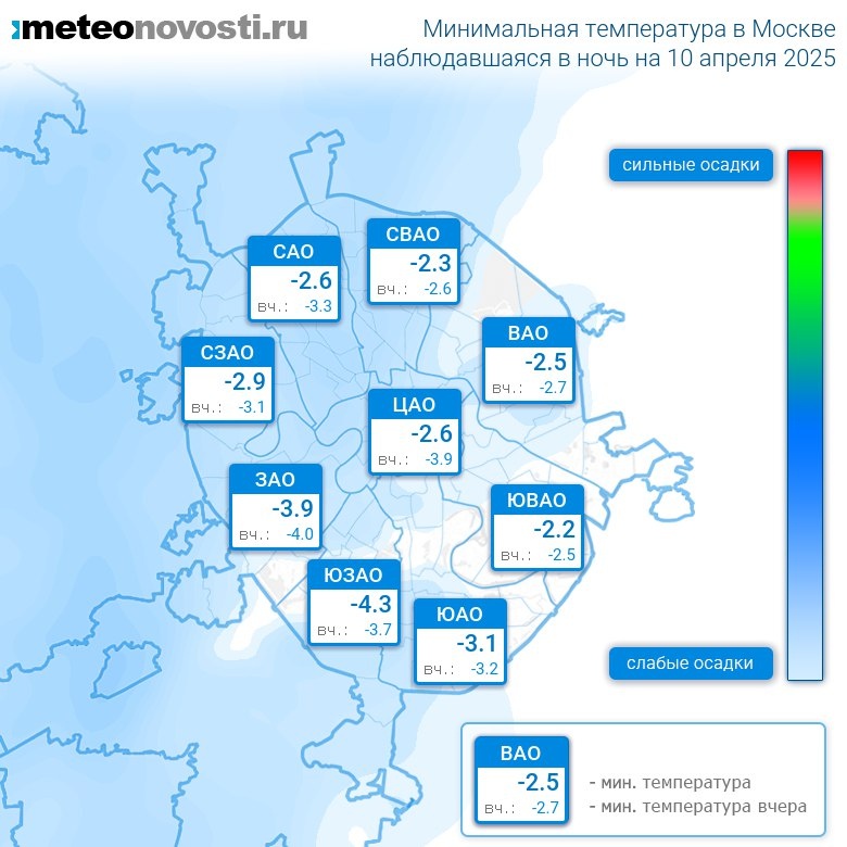 #за12часов #ночь Прошедшая ночь на 10 апреля была на 0.2°C теплее предыдущей. Минимальная температура ночью в Москве оказалась на 3.8°C ниже нормы, что немного холоднее, чем обычно. Самая низкая температура -4.3°C была зафиксирована в 4 часа на юго-западе города, а теплее всего было в центре: -1.3°C. Разница по минимальной температуре в разных частях столицы составила за минувшую ночь 3°C. Максимальные порывы ветра ночью достигали 5 м/с. Атмосферное давление за ночь понизилось с 739 до 738 мм.рт.ст. Осадков не наблюдалось. Самая холодная ночь в Москве 10 апреля наблюдалась в 1881 году, когда минимальная температура составила -14.3°C, а самая теплая в 1975 году с температурой +8.3°C. Перейти на сайт Прогноз погоды на 14 дней
