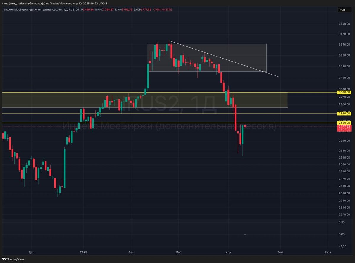 🗓 Четверг 10 апреля 2025, ситуация на утро Вчера был очень интересный день, в рамках которого ходили и вниз и вверх, настоящие горки были на рынке, особенно на америке 🎢 Вечером вышли новости о приостановке действия пошлин со стороны США, на чем рынок США, сырье и наш Индекс Мосбиржи 🇷🇺 $IMOEXF $MXM5 $MMM5 показали хорошую ракету 🚀 прошел хороший шорт сквиз. По Индексу Мосбиржи показали хорошую дневную откупную свечу, но весь движ прошел на вечерней сессии. Тут наиболее интересно смотреть на фьючерс на индекс Мосбиржи: - на часовом таймфрейме мы четко подошли к уровню локального сопротивления, будем наблюдать, получится ли его пробить - на дневках по фьючерсу мы немного перебили декабрьские лои (по самому индексу до них не дошли), после чего прошел мощный выкуп Дальнейшее развитие событи по прежнему сильно зависит от новостей. Лично мое мнение - текущая волна падения закончилась, далее, так или иначе нас ждет деэскалация (скорее всего только во 2м полугодии, но все же), на че