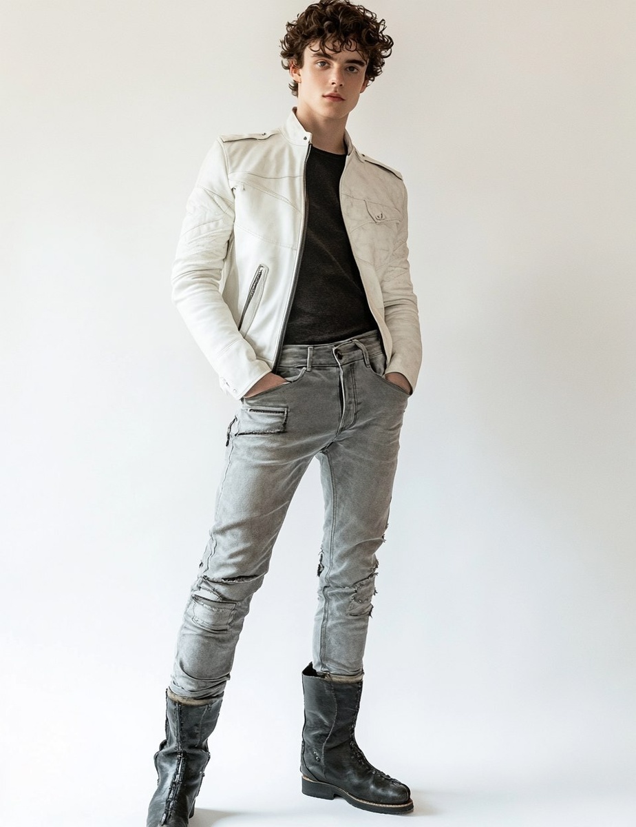 Создано на основе запроса: realistic candid Photograph Full-body shot of a tall, white man with short curly brown hair. He is Slim, Tan, and he looks like tim chalamet. He is wearing grey jeans and a white leather racing jacket on. he standing against a white background. He has low black distressed leather futuristic boots on, that have a pointed tow. Taken in the style of David la Chappell. The photograph is taken at eye level of the model. The photograph is taken in the style of behind the scenes rock documentary Captured in high-resolution photography using a Hasselblad X2 Black and white photography. studio portrait style with mid-contrast shadows and high-resolution quality. --- Автоперевод: Реалистичная откровенная фотография, выстрел на все телу высокого белого человека с короткими вьющимися каштановыми волосами. Как тебе это изображение? 🤔 https://dzen.ru/id/65c0c65c86e4f837c27b24d7 #ИИ #AI #нейросеть #midjourney #art