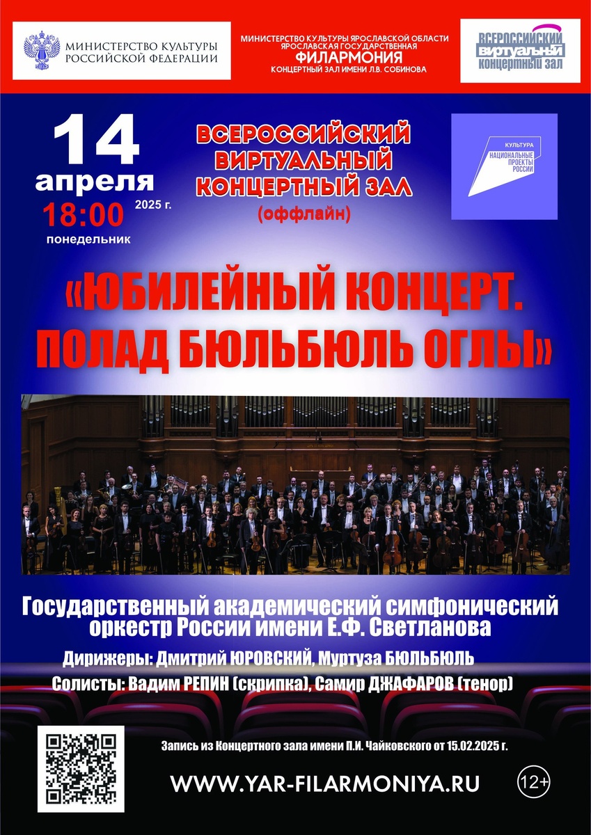 Приглашаем на концерт в рамках проекта Министерства культуры Российской Федерации «Всероссийский виртуальный концертный зал» 14 апреля 2025 г. Прозвучит запись юбилейного концерта Полада Бюльбюль оглы, который состоялся 15 февраля 2025 года в Концертном зале имени П. И. Чайковского. Вход свободный. Полад Бюльбюль оглы принадлежит к числу ярких представителей современного музыкального искусства. Он был одним из самых гастролирующих советских певцов, побывал с концертами более чем в 70 странах мира. Написанные им композиции исполняли Муслим Магомаев, Иосиф Кобзон, Лев Лещенко, Людмила Сенчина. Его саундтреки звучат в таких фильмах, как «Следствие продолжается» (1966), «Поет Муслим Магомаев» (1971), «Счастья вам девочки!» (1972), «Попутный ветер» (1973), «Пусть он останется с нами» (1974), «Бухта радости» (1977), «Бабек» (1979), «Дорожное происшествие» (1981), «Судьба государя» (2008).Бюль-бюльоглы является автором самой разной музыки, в том числе крупных симфонических произведений, камер