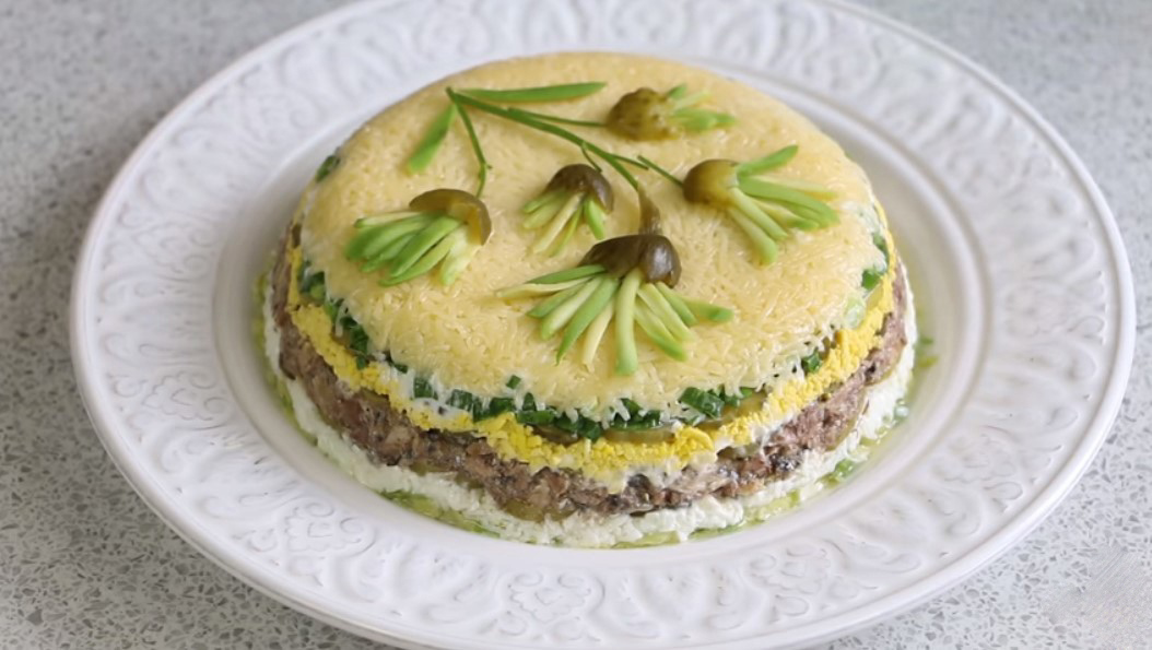 Сыр - 100 г. Чеснок - 1 зубчик. Майонез - 200 г. Зеленый лук - маленький пучок. Огурец свежий - 1 шт. Яйца - 2 шт. Рыбная консерва (треска) - 1 баночка. Авокадо - 1 шт. Шаг 1 Сыр натереть на крупной терке и смешать с выдавленным через чеснокодавилку чесноком. Шаг 2 Зеленый лук помыть, обсушить и мелко нарезать. Шаг 3 Свежий огурец нарезать мелкими кубиками. Шаг 4 Треску вынуть из банки и размять вилкой. Шаг 5 Яйца отварить в крутую, остудить в холодной воде, очистить от скорлупы, отделить белки от желтков. Белки натереть на крупной терке и смешать с рыбой. Желток натереть на крупной терке или просто размять вилкой. Шаг 6 Авокадо разрезать пополам, удалить косточку, очистить от кожуры и натереть на крупной терке. Шаг 7 Выкладывать салат слоями в форму без дна, предварительно застелить пищевой пленкой: 1-й слой - сыр с чесноком, смазать майонезом, затем зеленый лук, огурец, смазать майонезом, затем желтки, потом рыба с яичными белками, смазать немного майонезом, и последний слой - авока