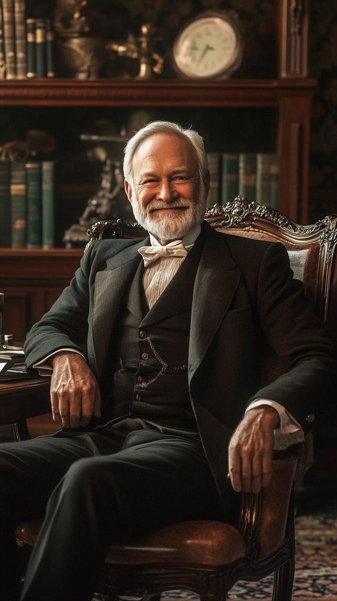 Создано на основе запроса: Andrew Carnegie, early 1890s, wealthy industrialist in a lavish office, books and steel models around him, soft light, smiling confidently, portrait style, cinematic, --- Автоперевод: Эндрю Карнеги, начало 1890 -х годов, богатый промышленник в роскошном офисе, книги и стальные модели вокруг него, мягкий свет, уверенно улыбающийся, стиль портрета, кинематографический, Какое твое мнение? 🤔 https://dzen.ru/id/65c0c65c86e4f837c27b24d7 #ИИ #AI #нейросеть #midjourney #art