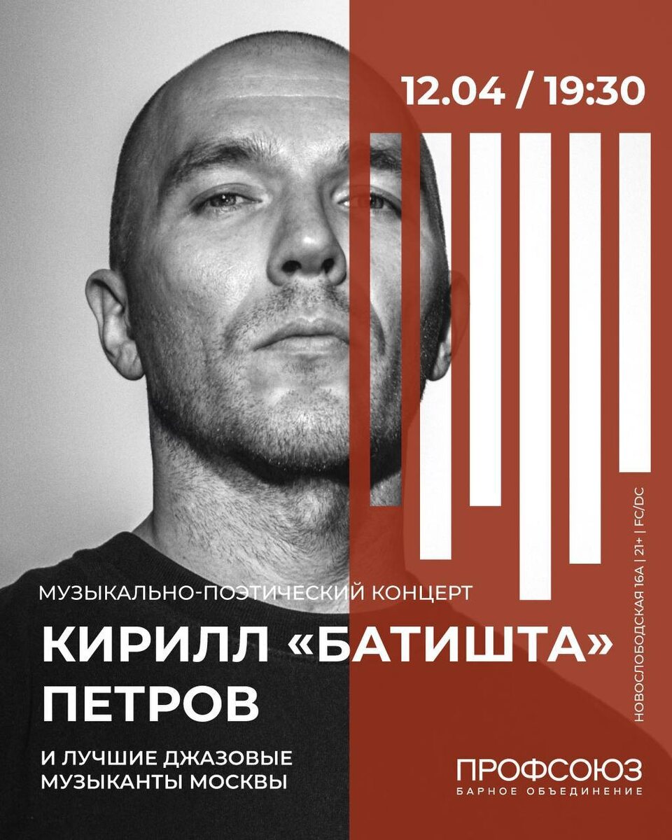 ПРОФСОЮЗ/ БАТИШТА 12 апреля в 19:30 В рамках проекта Грани Поэзии 12 апреля в ПРОФЕ выступит поэт, творец и музыкант — Кирилл «Батишта» Петров, известный многим по проекту «Банд’Эрос». Однажды Кирилл взял паузу в жизни поп-звезды, получил актерское образование и весной 2019 года вновь предстал перед публикой с сольным альбомом под названием «Версия 6». Батишта вернулся на музыкальную сцену с совершенно новым звучанием, перемешивая хип-хоп с мелодекламацией и поэзией и на собственном примере доказывая одну вневременную истину: настоящему творчеству тесно в рамках одного жанра! 🎫 Билеты 📆 12 апреля в 19:30 📍 Профсоюз, Москва, Новослободская ул., 16А