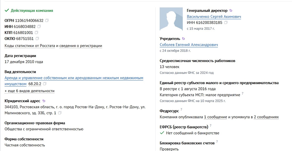 На сайте думы не указано, но по данным из открытых источников Евгений Соболев также является собственником ООО «Фортуна-1». Это ООО раньше управляло авторынком. В 2024 году выручка компании составила 33,8 млн рублей, а чистый убыток — 6 млн рублей.