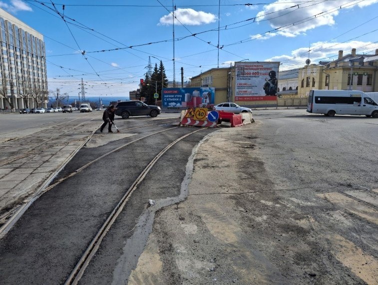заасфальтировали участок возле трамвайных путей