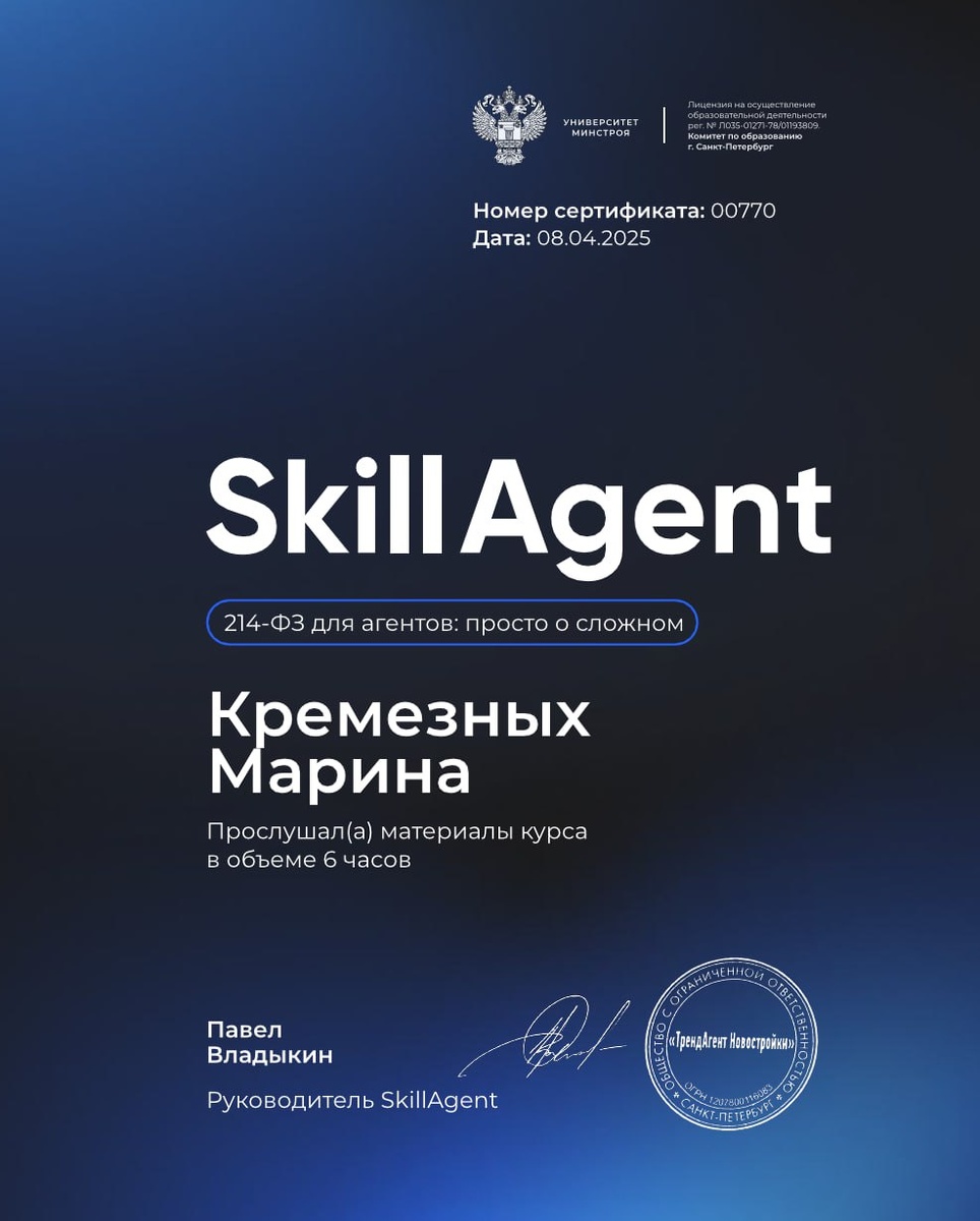 Квалификация подтверждена. Вчера ночью сдавала тест по соблюдению 214 ФЗ. Это основной закон регулирующий отношения, и ответственность Застройщик-Дольщик (покупатель). принимаем поздравления ❤️