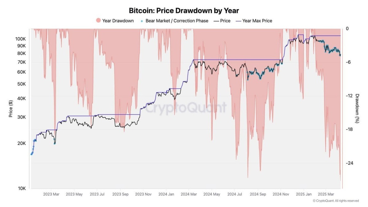 Текущее снижение цены BTC является крупнейшим в этом цикле — 27%.