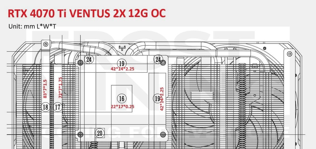 Всем доброго времени суток! Сегодня мы затронем вендер MSI, расскажем вам какие толщины термопрокладок используются в моделях RTX 4070 Ti, присаживайтесь! Система охлаждения почти на всех Ventus сделана очень дешево и сердито. Сама по себе видеокарта "шустрая". На памяти видеокарты установлены термопрокладки толщиной 2.25 мм, на зоне питания 1.5 мм и 1.75 мм. Для данной видеокарты советуем использовать термопрокладки FrostMining Maximum Thermal Pads 20 Вт/мК, а для графического процессора идеально подойдет термопаста OTK-1. На памяти видеокарты установлены термопрокладки 2.25 мм, на зоне питания 1.5 мм и 1.75 мм. На память видеокарты советуем использовать термопрокладку FrostMining 30 Вт/мК, термопрокладка уже разделена на чипы и резать ничего не нужно! Термопрокладок довольно много, из-за фронт-плейта. На нем все термопрокладки 1.5 мм. Со стороны бекплейта 3 мм. Советуем использовать термопрокладку с фазовым переходом и термопрокладками FrostMining Maximum Thermal Pads 20 Вт/мК. MS