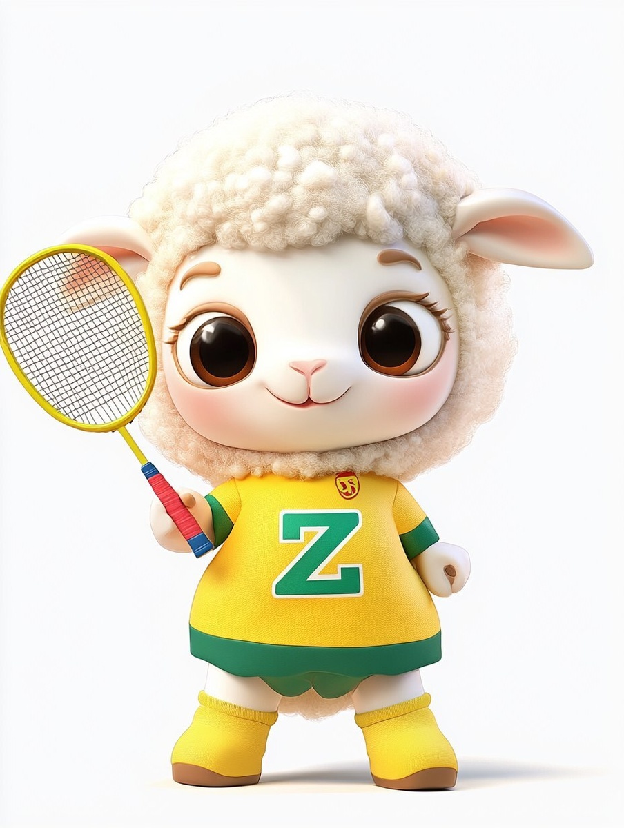Создано на основе запроса: A cute sheep wearing yellow and green sports , playing badminton with the letter "Z" on his chest. The whole body is shown in Pixar style. White background. Full of sunshine. Chibi character design. A cute little lamb IP figure. C4D rendering effect.