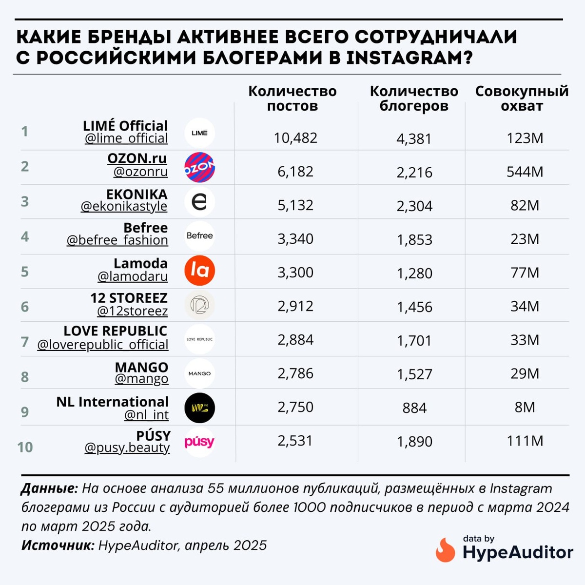 Какие бренды активнее всего сотрудничают с российскими блогерами в Instagram* — эксклюзивная инфографика от HypeAuditor. Команда HypeAuditor составила рейтинг брендов по количеству упоминаний в Instagram* на основе анализа 55 миллионов публикаций от блогеров из России с аудиторией более 1000 подписчиков (период: март 2024–март 2025). В список вошли такие компании, как LIMÉ, OZON, EKONIKA, Lamoda, Befree и другие. *Соцсети Instagram и Facebook запрещены в РФ; они принадлежат корпорации Meta, которая признана в РФ экстремистской.