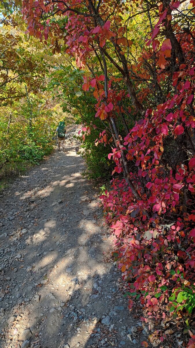 по дну ущелья будет бежать река Шелен. Но и отсутствие воды совершенно не портит вид. Невозможно отвести взгляд от высоких кустов огненной скумпии!