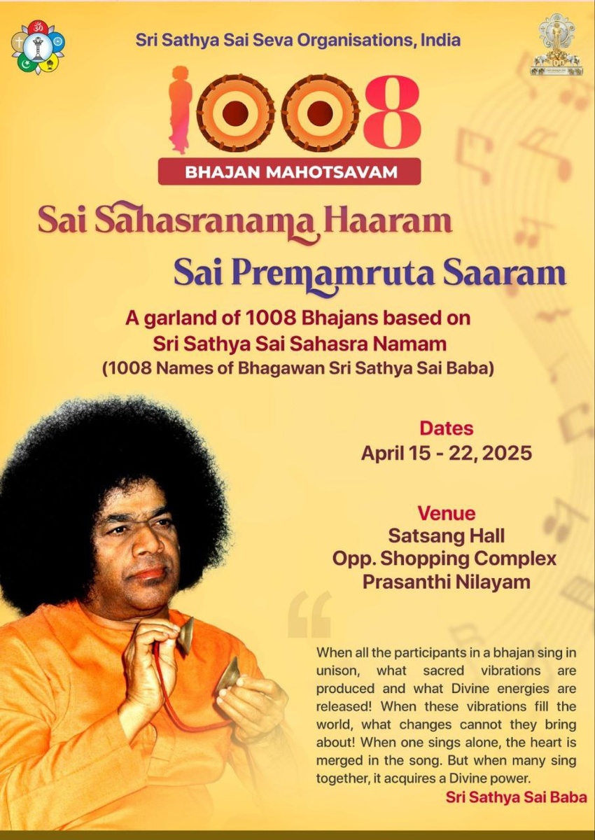 Аум Шри Саи Рам 🙏 Саи Сахасранама Харам Саи Премамритам: празднование Любви и Преданности! Присоединяйтесь к нам в Прашанти Нилаям с 15 по 22 апреля 2025 года, когда мы будем праздновать 1008 имён нашего любимого Свами. Эта программа является кульминацией бхаджанов со всей Индии и является особой частью празднования столетия Свами. *место проведения: Прашанти Нилаям, Сатсанг Холл (напротив Торгового центра) Джей Саи Рам 🙏