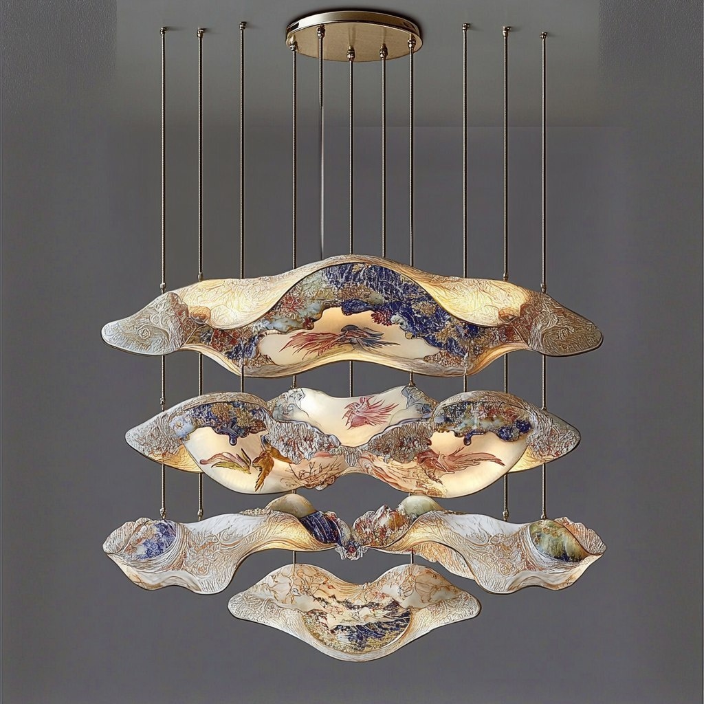 Создано на основе запроса: a modern chandelier design. The chandelier should incorporate the original pattern in a creative and elegant way, with soft ambient lighting, minimalistic yet artistic structure, hanging gracefully from the ceiling. Focus on a modern aesthetic with unique visual impact --- Автоперевод: Современный дизайн люстры. Как тебе такая картинка? 🤔 https://dzen.ru/id/65c0c65c86e4f837c27b24d7 #ИИ #AI #нейросеть #midjourney #art