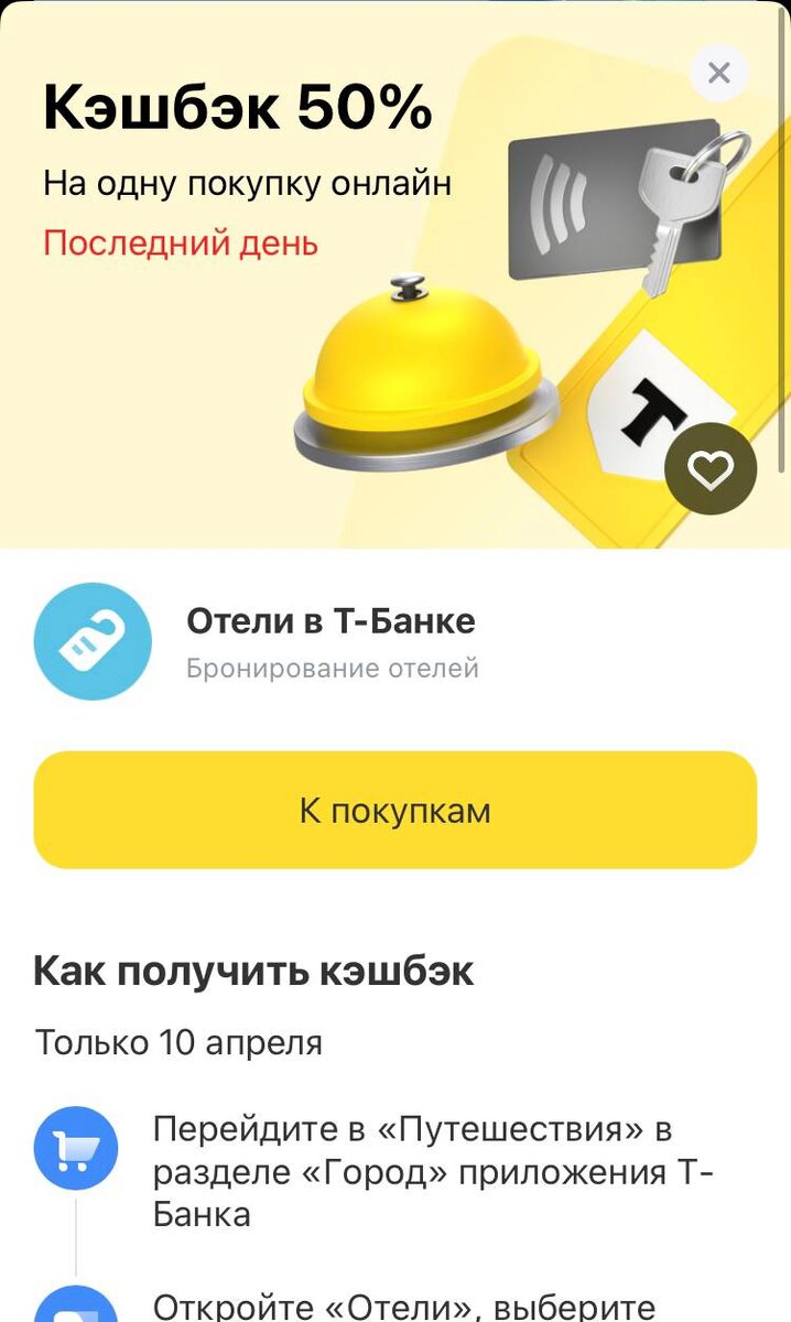 Проверьте кэшбек дня в Т-банке. Сегодня появилось предложение с 50% кэшбеком на Отели при бронировании в сервисе Путешествия в разделе «город» приложении банка. Оплатить бронирование нужно онлайн, если будете оплачивать в отеле - кэшбек не начислим. Максимум вернут 2000 бонусов. А также до 11 апреля можно купить 1 упаковку подгузников Huggies Elite soft со 100% кэшбеком. При условии, что покупку совершите на Wildberries. Максимум начислят 650 бонусов. Не забудьте отсканировать чек в приложении.
