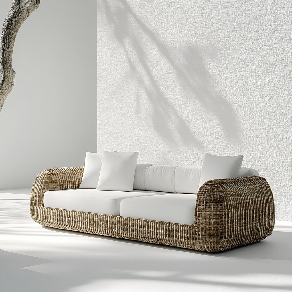 Создано на основе запроса: woven cane minimalist outdoor darbed with white seating, luxe, ultra minimalist modern in the style of paola lenti, white background studio shoot , sunshine