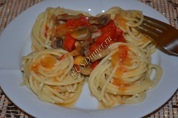 Спагетти с грибами, помидорами и болгарским перцем Ингредиенты: Макароны - 300 гр. (спагетти) Грибы шампиньоны - 300 гр. Помидоры - 300 гр. Перец болгарский - 200 гр. Лук репчатый - 1 шт. Масло растительное - 50 мл. Соль - 5 гр. Перец черный молотый - 5 гр. Источник: https://rusdinner.ru/page/spagetti-s-gribami-pomidorami-i-bolgarskim-percem