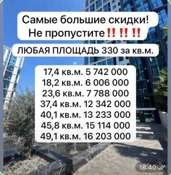 Сегодня город тряжнуло не по-детски, я не про землятресение. Но очень похоже. С каждого канала агента, у всех риелтора в вотсап летели с самого утра вот такие Банера. Это ЖК Сочи Парк, выложил на рынок цену за квадрат по 330 000 рублей. Еврострой, сегодня дал жару🔥🔥🔥 на всех своих объектах: ЖК Море, ЖК Сочи Парк, ГК Marina Garden. Прекрасные цены, замечательные условия. Надо брать. Вот так приходит пора «котлованых» цен. Застройщику нужны деньги, и уж лучше он прогнется перед покупателем, чем перед банком проектного финансирования. А кто по-шустрее, тот не упускает свой шанс купить квартиру по цене 3-х летней давности. @MSvyatoslav Скидки, это заразительно. Сначала Ava -group (-20% долбанула), сейчас Еврострой , кто следующий? #крым #евпатория #скидки #акции #стратегия #доход #котлован