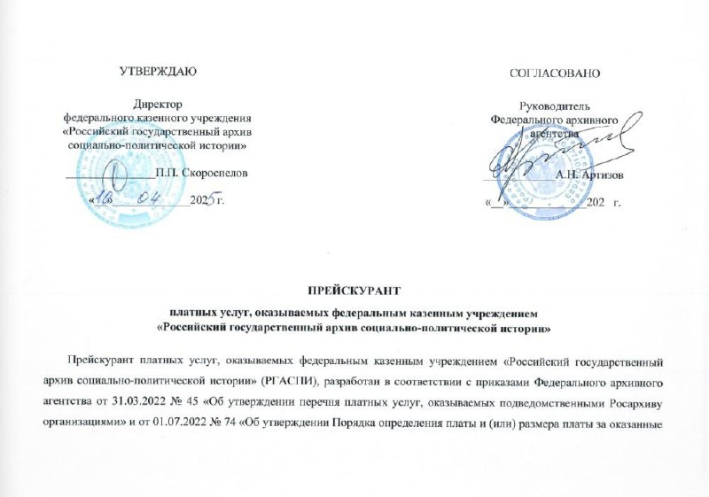 Обновленный прайс «Российского Государственного архива социально-политической истории» (РГАСПИ) Что тут ищем? Информацию о: - трудовом стаже - переименовании организаций - об обучении в учебных заведениях - о заработной плате и гонорарах - о получаемой стипендии - о награждении почетной грамотой - о награждении значком (знаком) ЦК ВЛКСМ и ЦС ВПО имени В.И. Ленина - об участии в партизанском движении в годы Великой Отечественной Войны - о поиске учетно-партийных документов Как подать запрос? Перейти на сайт и заполнить нужный шаблон Что вообще хранит архив? Подробный перечень фондов можно посмотреть тут Прайсы архивов 04.2025: 1. «Российского Государственного архива социально-политической истории» (РГАСПИ) 2. «Государственный архив Пензенской области» (ГАПО) 3. «Объединенный государственный архив Оренбургской области» (ОГАОО) 4. продолжу общий список.... Источник: https://vk.com/wall-35550076_7670 ➿➿➿➿➿➿➿➿➿➿ 🔗Ссылки на ресурсы: - Копилка знаний с именными списками - Подписаться