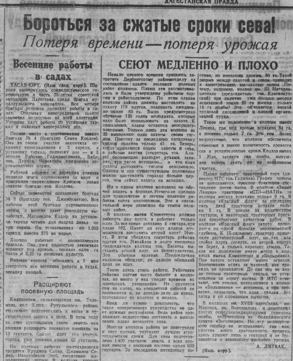 Плохо работает тракторный парк (директор МТС тов. Гаджиев). График пахоты не выполняется, простои тракторов составляют сотни часов. В колхозе «Знамя Ленина» трактором «СТЗ-НАТИ» за полтора месяца вспахано только 9 га. В колхозе «Красный флаг» за последние пять дней трактором вспахан только 1 га. В погоне за количеством гектаров, в некоторых тракторных бригадах пренебрегают качеством работы. В колхозе «Красный флаг» пахота проводится по одной борозде неравномерной глубины. К 15-сильному трактору прицепили двухкорпусный плуг, но так, как стойка плуга согнута, то второй корпус не берет, а только царапает землю. Такое же положение имеет место в колхозах имени Коминтерна и «Большевик». При пахоте оставляют много огрехов. Боронование вслед за пахотой, как правило, не проводится. До сих пор не везде готовы тракторные сеялки, не установлены на норму высева. В МТС отвечают, что сеялки, находящиеся в колхозе «Большевик» — исправны, а при проверке оказалось, что одна сеялка без диска и со сломанным рычагом.