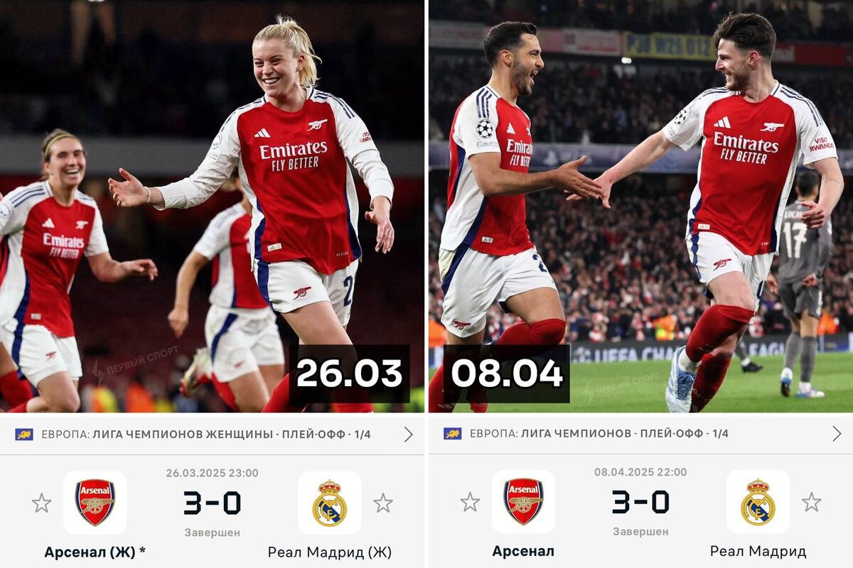 Аномальные мега-совпадения в Лиге Чемпионов! Мужской и женский «Арсенал» одинаково разгромили «Реал»: обе игры 1/4 финала ЛЧ прошли на «Эмирейтс» с разницей в две недели и завершились со счётом 3:0. Также в обоих матчах был дубль английского игрока с фамилией на букву «Р», которого купили летом 2023-го (Райс и Руссо), и гол испанского игрока (Мерино и Кальдентей). Все голы были забиты во вторых таймах и в одни и те же ворота стадиона И ещё одно удивительное совпадение из другого матча ЛЧ: 15 марта 2011-го: Горан Пандев забил победный гол за «Интер» на отметке 87:28 в матче против «Баварии» на «Альянц Арене» 8 апреля 2025-го: Давиде Фраттези забил победный гол за «Интер» на отметке 87:28 в матче против «Баварии» на «Альянц Арене» Даже отпраздновали одинаково. Секунда в секунду!