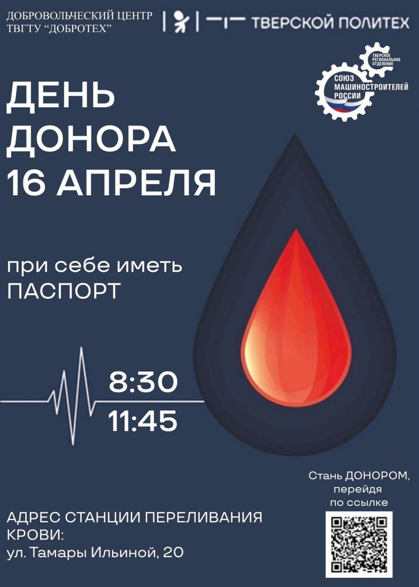 ДЕНЬ ДОНОРА📌 ✨16 апреля 2025 года студенты ТвГТУ из Добровольческого центра «Добротех» совместно с Союзом машиностроителей России организуют проект «День донора» 🩸ДОНОРСТВО - способ предотвратить инфаркт. Повышенная вязкость крови, ведущая к образованию тромбов – это одна из проблем, решить которую помогает донорство. 🩸Некоторые рекомендации из памятки для доноров перед сдачей крови: ❗️Не приходить, если чувствуете недомогание (озноб, головокружение, головную боль, слабость). ❗️Не курить за час до процедуры. ❗️Не принимать алкоголь за 48 часов до процедуры. ❗️Обязательно выспаться и позавтракать (сладкий чай, сухое печенье, каша на воде). ❗️Ограничить приём жирной и жареной пищи накануне сдачи крови. ❗️Не принимать анальгетики и аспирин, а также лекарства, содержащие эти вещества, за 3 дня до процедуры (они ухудшают свёртываемость крови). Больше рекомендаций - в файле по ссылке😉 ‼️Не забудь записаться на сдачу крови по QR-коду или заполнив форму по ссылке ниже😉‼️ https://doc