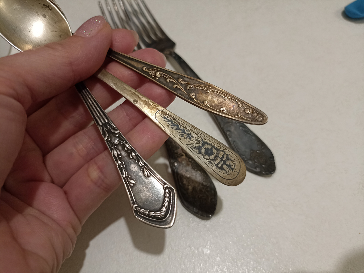 Дело было так. Накопилось у меня как-то за последнее время несколько мельхиоровых столовых приборов. То там попадется "грязная" ложка, то здесь обнаружиться замухрышка вилка. Процесс этот постоянный потому как постепенно разбираем в своих сараях, гаражах и квартирах семейные завалы "нужных" предметов, которые просто лежат уже 100500 лет с условным назначением "а вдруг пригодится".